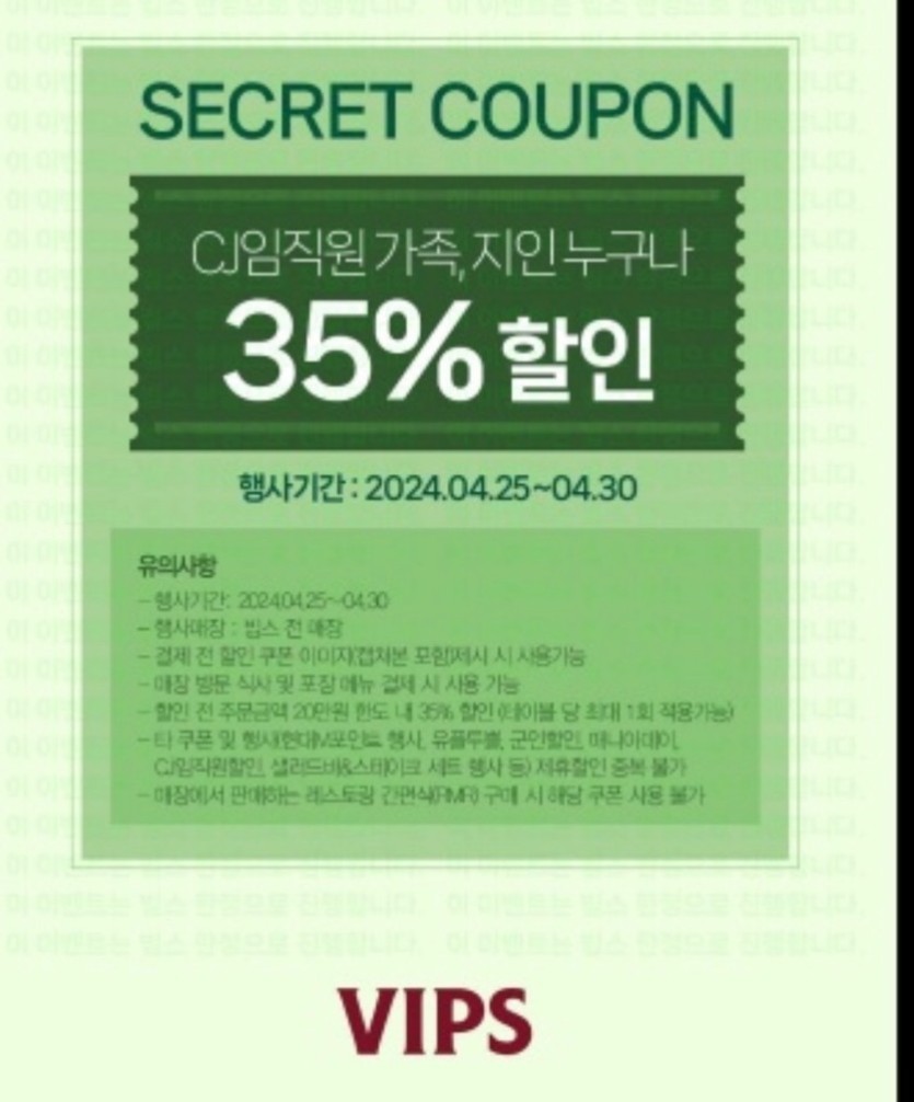 빕스 35% 시크릿 쿠폰입니다 (~4.30일까지)
