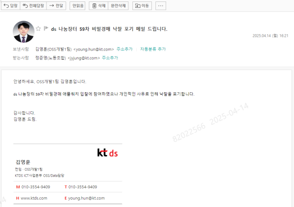 > 김영훈님이 개인적인 사정으로 낙찰을 포기하여 차순위인